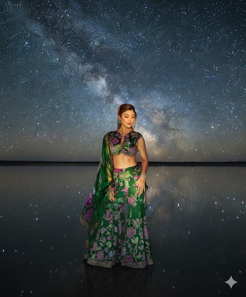ಬಾಲಿವುಡ್‌ನ ಫಿಟ್‌ನೆಸ್ ಐಕಾನ್ ಮತ್ತು ಸದಾ ಫ್ಯಾಷನ್ ಪ್ರಿಯರ ಗಮನ ಸೆಳೆಯುವ ನಟಿ ಶಿಲ್ಪಾ ಶೆಟ್ಟಿ ಕುಂದ್ರಾ, ಇತ್ತೀಚೆಗೆ ತಮ್ಮ ಇನ್‌ಸ್ಟಾಗ್ರಾಮ್ ಖಾತೆಯಲ್ಲಿ ಹಂಚಿಕೊಂಡಿರುವ ಹೊಸ ಫೋಟೋಶೂಟ್ ಚಿತ್ರಗಳ ಮೂಲಕ ಮತ್ತೊಮ್ಮೆ ಎಲ್ಲರನ್ನೂ ಬೆರಗುಗೊಳಿಸಿದ್ದಾರೆ. ಹಸಿರು ಬಣ್ಣದ ಕಸೂತಿ ಮಾಡಿದ ಶರಾರಾ ಡಿಸೈನರ್‌ವೇರ್‌ನಲ್ಲಿ ಅವರು ಕಂಗೊಳಿಸಿದ್ದು, ಅವರ ಆಕರ್ಷಕ ನೋಟ ಮತ್ತು ಸೌಂದರ್ಯಕ್ಕೆ ನೆಟ್ಟಿಗರು ಫಿದಾ ಆಗಿದ್ದಾರೆ.