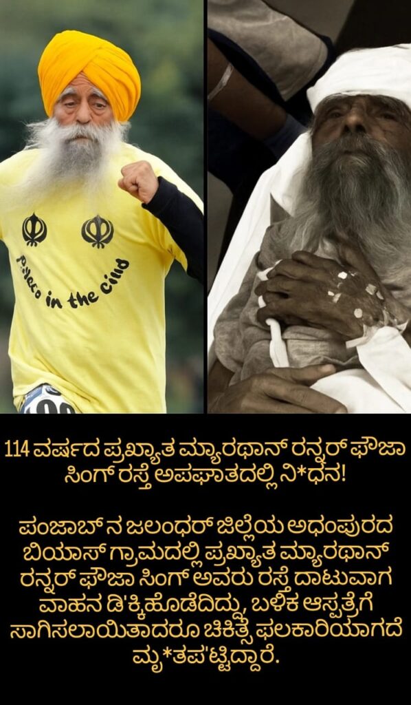 ವಿಶ್ವದ ಅತ್ಯಂತ ವಯಸ್ಕ ಮ್ಯಾರಥಾನ್ ಓಟಗಾರರಾಗಿ ಪೌರಾಣಿಕ ಸ್ಥಾನ ಪಡೆದಿದ್ದ 114 ವರ್ಷದ ಫೌಜಾ ಸಿಂಗ್ ಅವರು ಇಂದು ಬೆಳಿಗ್ಗೆ ದೆಹಲಿ ಹೊರವಲಯದ ಗುರುಗ್ರಾಮ್ನಲ್ಲಿ ಸಂಭವಿಸಿದ ರಸ್ತೆ ಅಪಘಾತದಲ್ಲಿ ದುರ್ಘಟನಾತ್ಮಕವಾಗಿ ನಿಧನರಾದರು. ಶತಮಾನದ ಜೀವಂತ ಚರಿತ್ರೆಯಂತಿದ್ದ ಈ ಮ್ಯಾರಥಾನ್ ಯೋಧನ ಅಂತಿಮ ಯಾನವು ಕ್ರೀಡಾ ಲೋಕ ಹಾಗೂ ವಿಶ್ವದಾದ್ಯಾಂತ ಅಭಿಮಾನಿಗಳಿಗೆ ಆಘಾತವನ್ನುಂಟುಮಾಡಿದೆ.