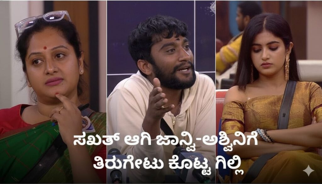 ಬಿಗ್ ಬಾಸ್ ಮನೆಯಲ್ಲಿ ಅಶ್ವಿನಿ ಧೈರ್ಯತೋರಿಸಿ ಗಿಲ್ಲಿ ನಟದಿಂದ ಪಾಠ ಕಲಿಸಿದ್ದಾರೆ, ಜಾನ್ವಿ ಮೌನದಿಂದ ಪ್ರತಿಕ್ರಿಯೆ. ಮನೆಯಲ್ಲಿ ಶಿಸ್ತು ಮತ್ತು ಗೌರವ ಮಹತ್ವ.