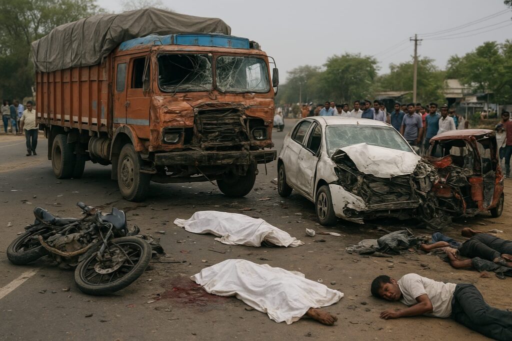 ಮಧ್ಯಪ್ರದೇಶದಲ್ಲಿ ಸಂಭವಿಸಿದ ಒಂದು ಭೀಕರ ರಸ್ತೆ ಅಪಘಾತ ಸ್ಥಳೀಯರಲ್ಲಿ ಬೆಚ್ಚಿಬೀಳುವಂತಾಗಿದೆ. ಕುಡಿದ ಮತ್ತಿನಲ್ಲಿ ಟ್ರಕ್ ಚಾಲನೆ ಮಾಡಿದ ವ್ಯಕ್ತಿಯ ನಿರ್ಲಕ್ಷ್ಯದಿಂದ ಹಲವು ವಾಹನಗಳು ನಾಶವಾಗಿದ್ದು, ಇಬ್ಬರು ದುರ್ಮರಣ ಹೊಂದಿದ್ದಾರೆ. ಇದಲ್ಲದೆ, 11 ಮಂದಿಗೆ ಗಂಭೀರ ಹಾಗೂ ಸಣ್ಣಪುಟ್ಟ ಗಾಯಗಳಾಗಿವೆ.